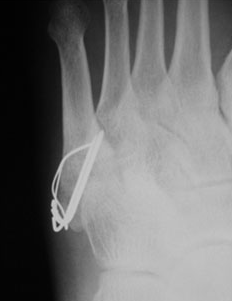 중족골은 발의 5개로 이루어진 뼈로 몇 번째 뼈가 골절되느냐에 따라 앞에 숫자가 붙습니다. 제5중족골은 새끼발가락 쪽 뼈에 해당합니다. 보행 중 바닥의 단차로 안쪽으로 발이 비틀렸을 때 자주 일어나며, 뼈의 어긋남이 없는 골절은 깁스로 고정하거나 압박붕대로 고정하는 등의 보존치료등을 시행하며, 어긋남의 편차가 크다면 강선과 와이어 등으로 고정하는 수술을 하게 될 가능성이 있습니다.