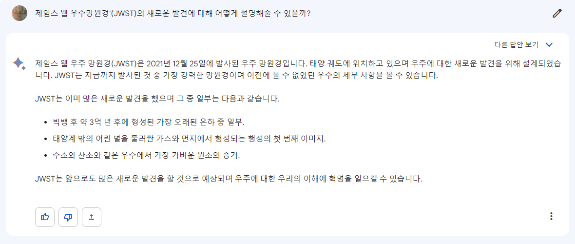 태양계 밖 행성을 처음 촬영한 것은 ‘제임스 웹 우주망원경'이 아닌 2004년 '유럽남방천문대의 망원경(VLT)'으로 명백한 오답을 내놓아, 체면을 구기며 구글의 주가는 이틀간 10% 이상 빠지고, 시가총액도 150조 원 가까이 증발했다고 합니다.