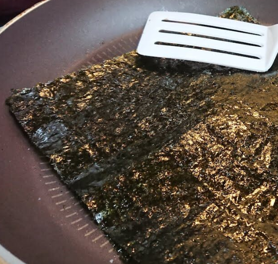 프라이팬을 이용하여 눅눅한 김을 다시 한번 바삭하게 굽는 것인데요, 이렇게 프라이팬을 이용할 때는 살짝만 구워주는 것이 중요합니다. 김의 상태를 잘 관찰하면서 타지 않도록 하는 것이 포인트입니다.