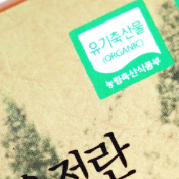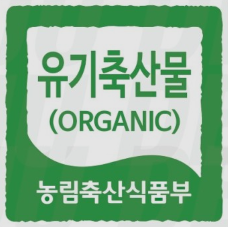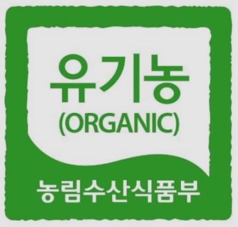 유기농 농산물은 농약과 화학비료를 전혀 사용하지 않고 키워낸 농작물을 말합니다. '유기농'이라고 적힌 초록색의 인증 마크가 표시되어 있습니다.