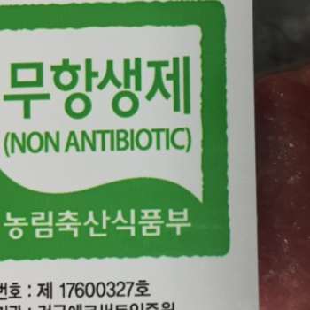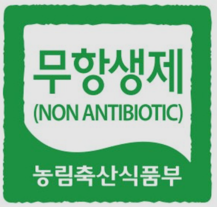 무항생제 축산물은 항생제를 전혀 사용하지 않고 키운 축산물을 말하며, 사료도 무항생제가 포함되어 있지 않은 사료만으로 키운 축산물입니다. '무항생제'라고 적힌 초록색 인증 마크가 표시되어 있습니다.