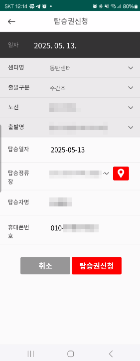 근무확정이 되면, 쿠팡에서 보내주는 공지사항 카톡에 셔틀버스 URL을 클릭하여 셔틀 앱을 다운로드하고 실행하면 위와 같은 화면이 나오는데, 탑승권신청을 눌러서 각 란을 기입하고 아래 사진처럼 탑승권신청을 하면 됩니다.