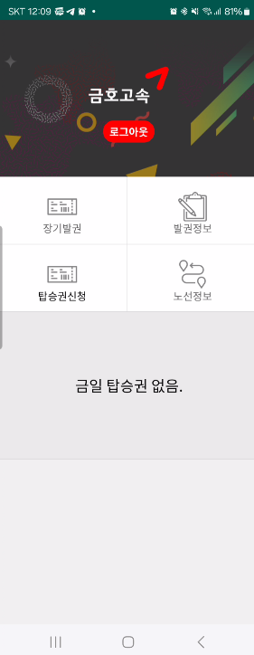 신청이 정상적으로 되었다면, 신청한 날자가 되면 위의 사진 "금일 탑승권 없음" 위치에 탑승권이 표시됩니다. 그리고 셔틀을 탈 때 탑승권을 눌러서 버스 입구에 있는 QR 코드를 인식시키고 탑승하면 됩니다. 참고로 탑승권 신청을 미리 하지 않으면 버스를 탈 수 없으니 반드시 미리 신청하시기 바랍니다.