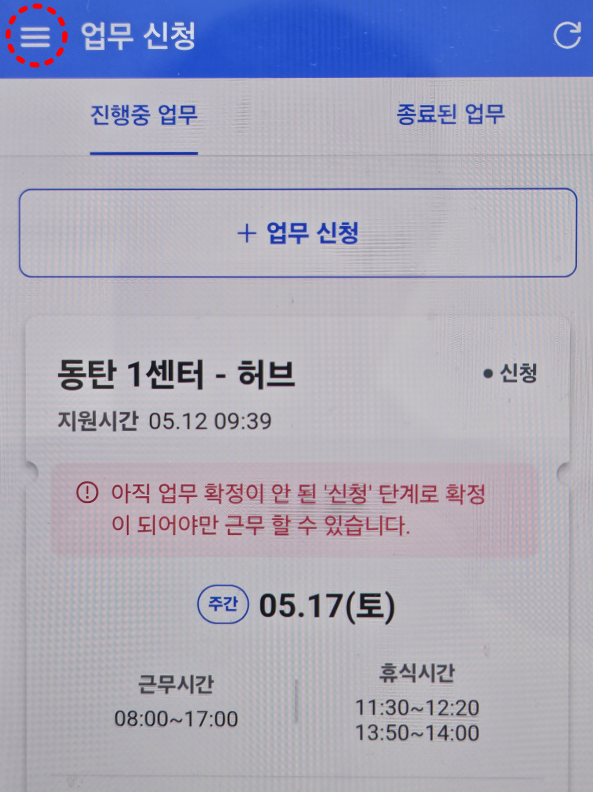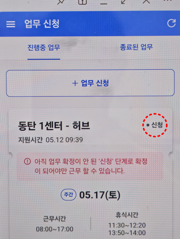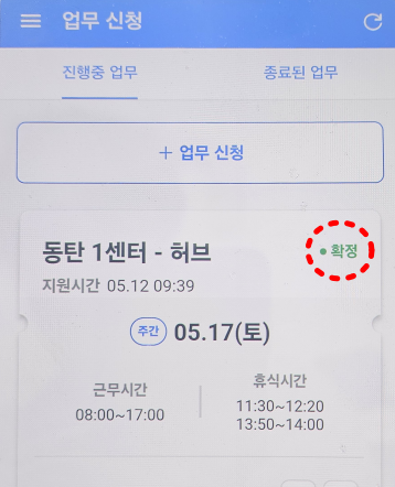 확정 카톡을 받고 쿠펀치를 들어가 보면 신청했던 업무가 표시되면서 아래 사진의 빨간색 동그라미 부분의 신청 상태였던 것이 녹색으로 "확정"이 된 것을 확인할 수 있습니다.