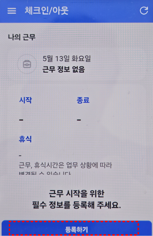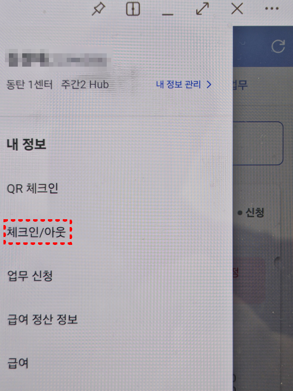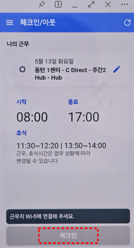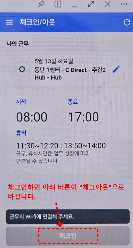 업무가 모두 끝나고 검색대를 지나 사물함을 열고 핸드폰을 찾자마자 가장 먼저 해야 할 일은 출근했을 때 체크인 했던 마지막 화면에서 체크아웃 버튼을 눌러서 반드시 체크아웃을 해야 합니다.