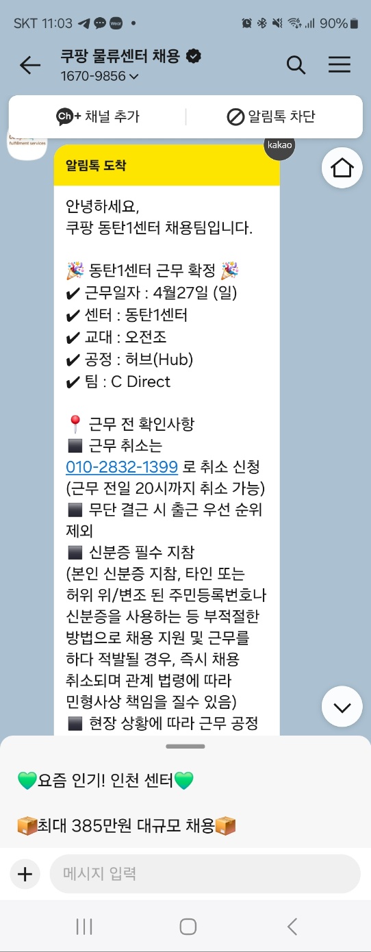 쿠펀치에 가입하면서, 거주지에서 가까운 쿠팡 물류센터를 인터넷으로 검색해 보고 자신에 맞는 센터를 선택하고, 희망하는 업무(IB, OB, HUB 등), 희망 근무시간 등을 기입하면, 신청한 날자 하루나 이틀 전에 확정 카톡이 옵니다.